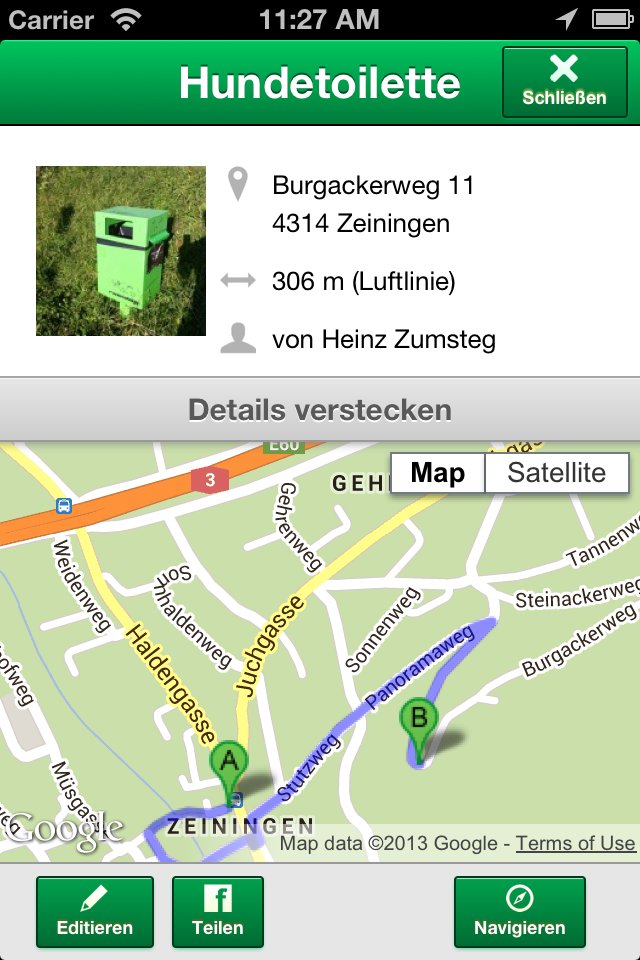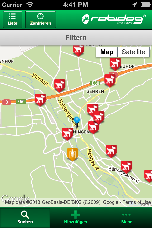 Finde die nächste Hundetoilette oder den nächsten Beutelspender. Melde selbst gefundene Objekte und helfe mit, unsere Umwelt sauber zu halten!